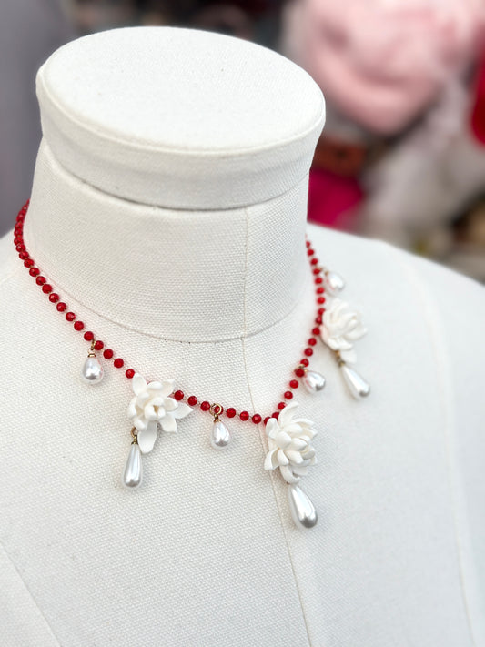 Trio Sampaguitas & Pearl Drops Choker Red Crystal Acrylic Necklace