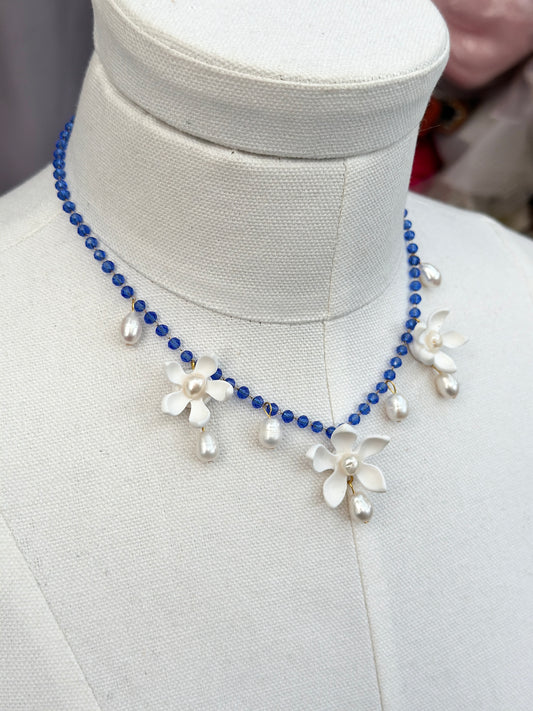 Trio Sampaguitas & Pearl Drops Choker Blue Crystal Acrylic Necklace